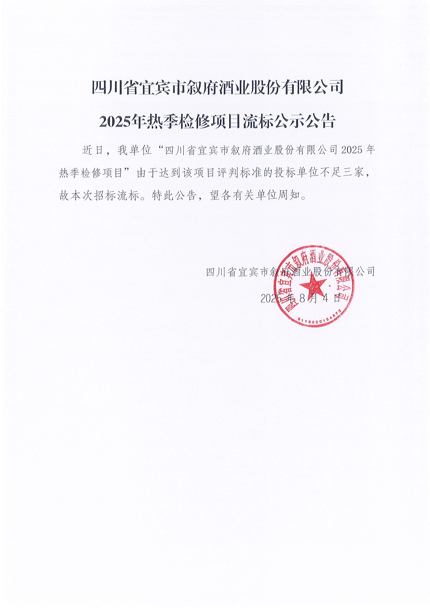 四川省宜賓市敘府酒業(yè)股份有限公司2025年熱季檢修項目流標公告