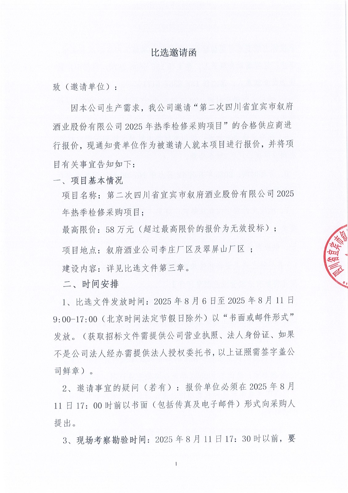 四川省宜賓市敘府酒業(yè)股份有限公司2025年熱季檢修項(xiàng)目流標(biāo)公告