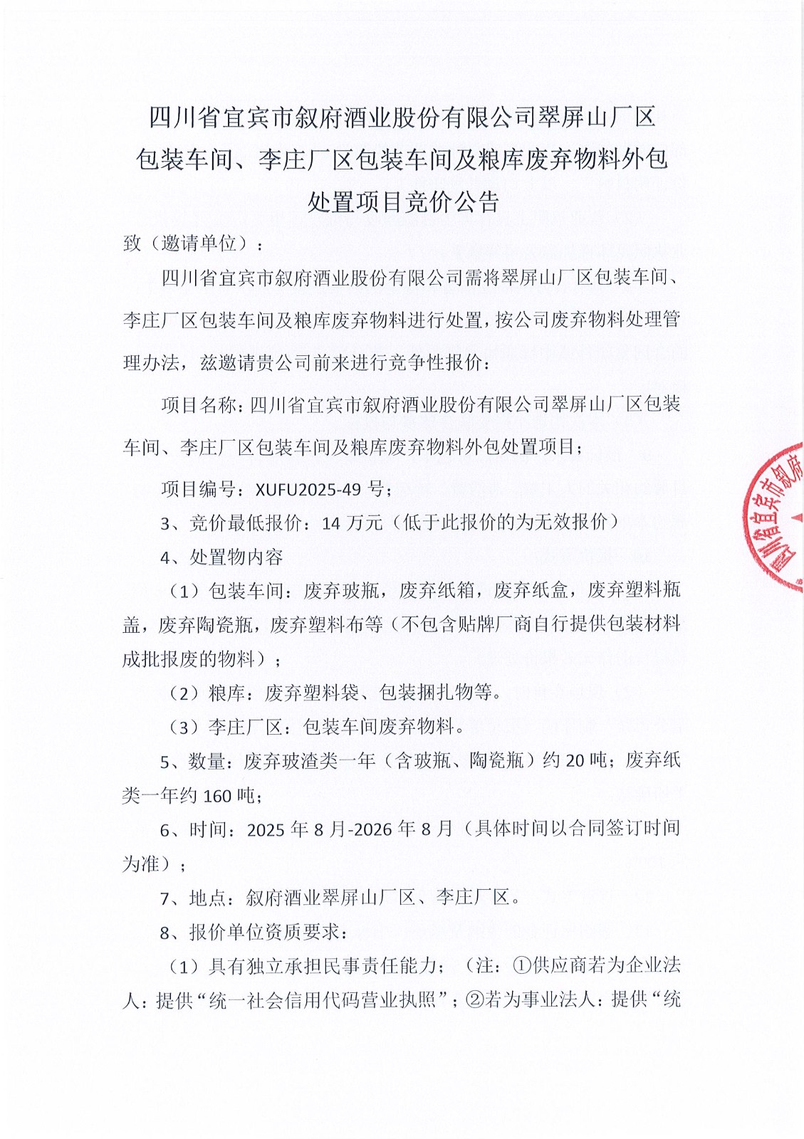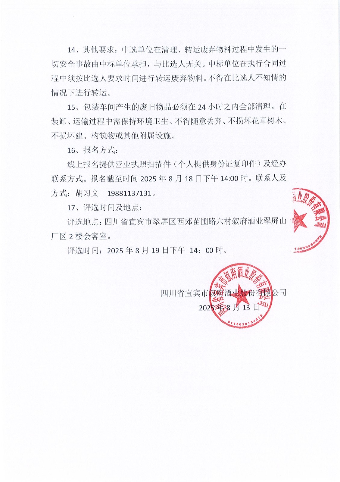 四川省宜賓市敘府酒業(yè)股份有限公司李莊粉碎車間2-5樓地面改造項目比選結(jié)果公告