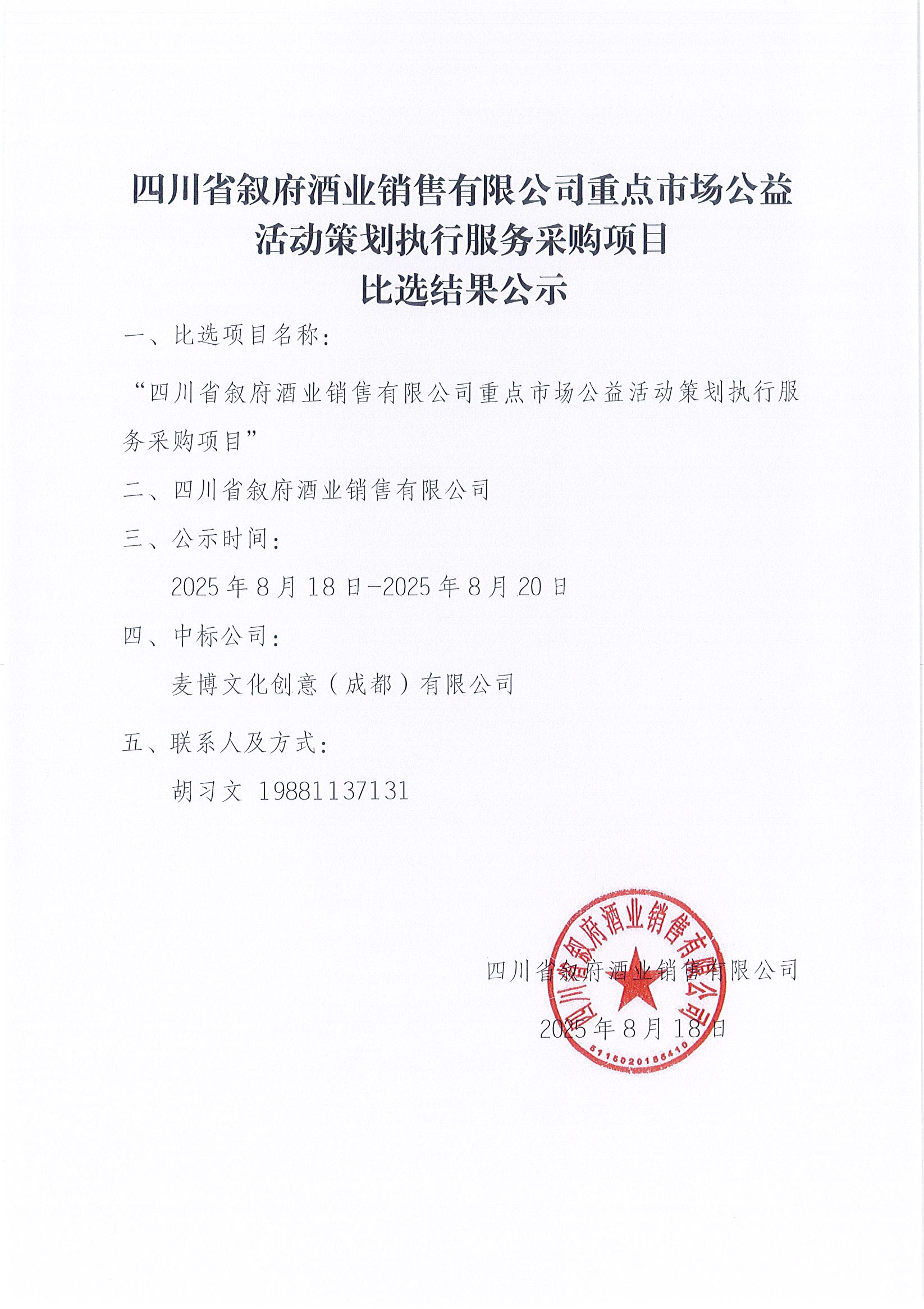 第二次四川省宜賓市敘府酒業(yè)股份有限公司2025年熱季檢修采購項(xiàng)目比選結(jié)果公示