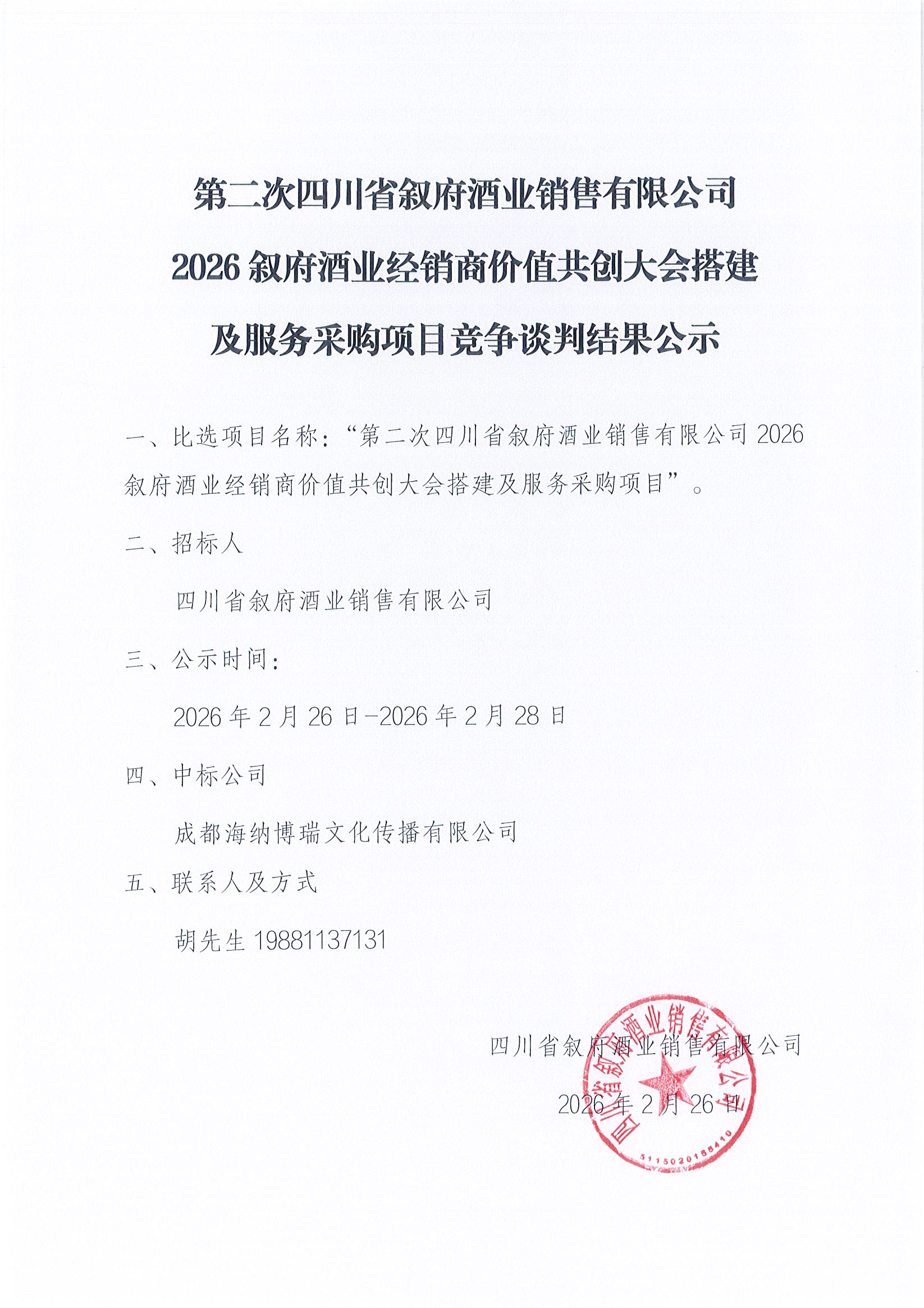 第二次四川省敘府酒業(yè)銷售有限公司2026敘府酒業(yè)經銷商價值共創(chuàng)大會搭建及服務采購項目競爭談判招標公告