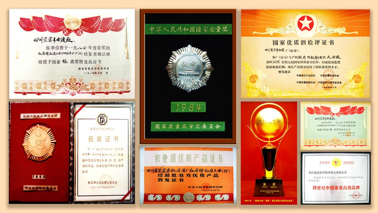 剛誕生3年的敘府大曲(藍(lán)標(biāo))代表敘府參與評比,一舉捧回“國家質(zhì)量獎銀質(zhì)獎?wù)隆焙汀皣覂?yōu)質(zhì)酒”稱號,自此拉開了敘府的四十年國優(yōu)旅程。